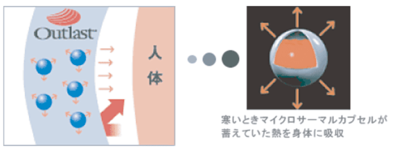 寒いときには、カプセルの中のパラフィンワックスが、蓄えていた熱をグングン放出して、液体から固体の状態に変わります。内部が固体に変わることで、熱を伝える能力が低下し、身体の熱を外部に逃がさず保温します。